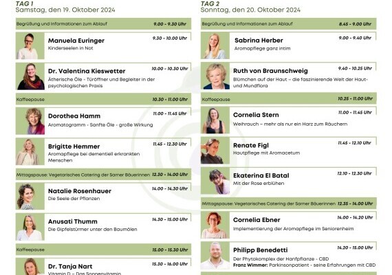 Diesmal mit 17 hochkarätigen Aroma- und Phytoexperten, wie z.B. Ruth von Braunschweig, Dr. Dorothea Hamm, Sabrina Herber, Anusati Thumm, Nathalie Rosenhauer, Ekaterina El Batal und weitere mehr, welche über die neuesten Erkenntnisse der Gesundheitsförderung durch Aromatherapie sprechen.
