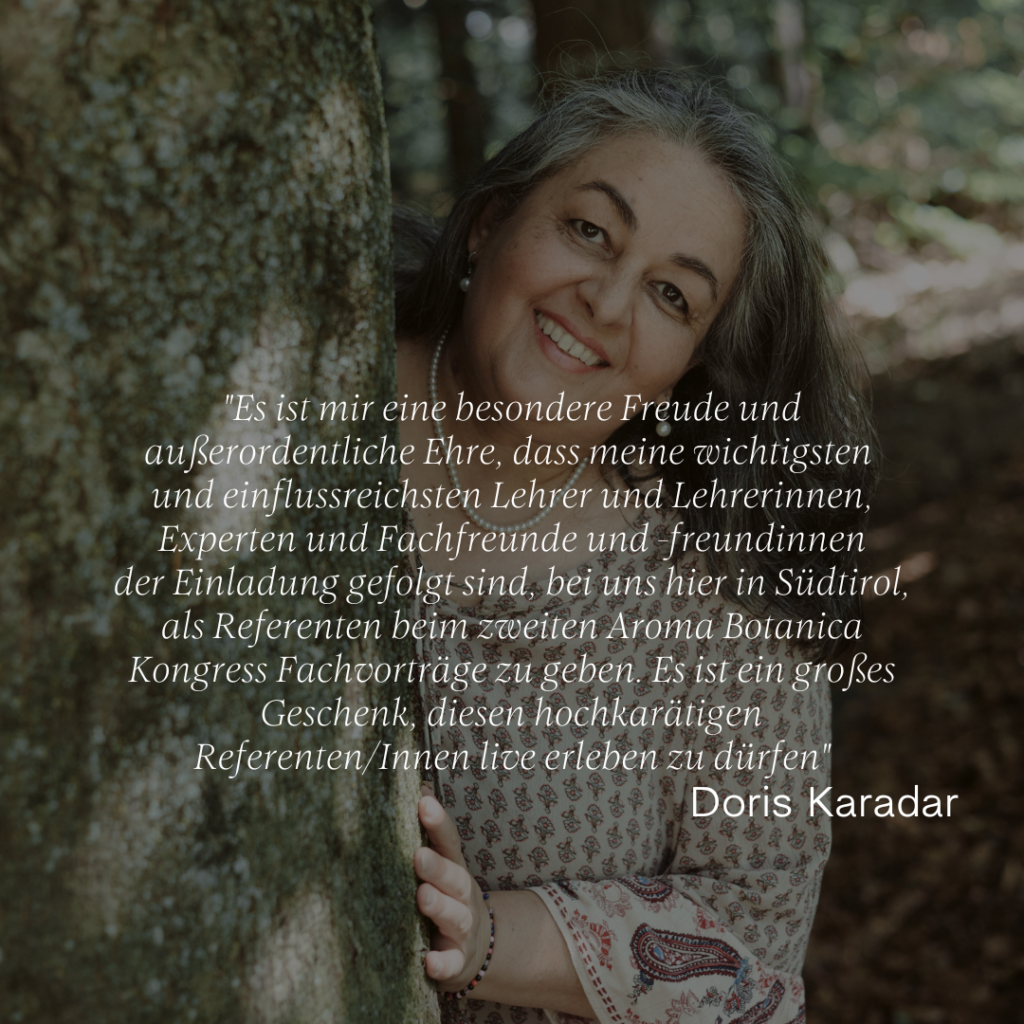 „Es ist mir eine besondere Freude und außerordentliche Ehre, dass meine wichtigsten und einflussreichsten Lehrer, Ausbilder und Fachfreunde der Einladung gefolgt sind, um hier in Südtirol als Referenten beim zweiten Aroma Botanica Kongress Fachvorträge zu halten. Es ist ein großes Geschenk, diesen hochkarätigen Referenten erleben zu dürfen“, so Doris Karadar.